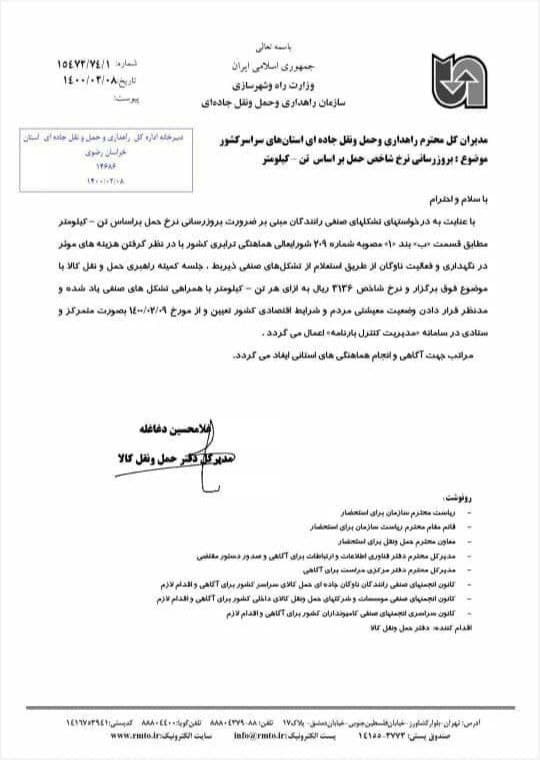 نرخ شاخص تن-کیلومتر با افزایش از مبلغ ۲۴۰۰ به مبلغ ۳۱۳۶ ریال به روز رسانی شد و از امروز (۹ اردیبهشت ماه ۱۴۰۰) به صورت متمرکز و ستادی در سامانه مدیریت کنترل بارنامه اعمال می شود.خبر (https://www.tinn.ir/fa/tiny/news-230201)