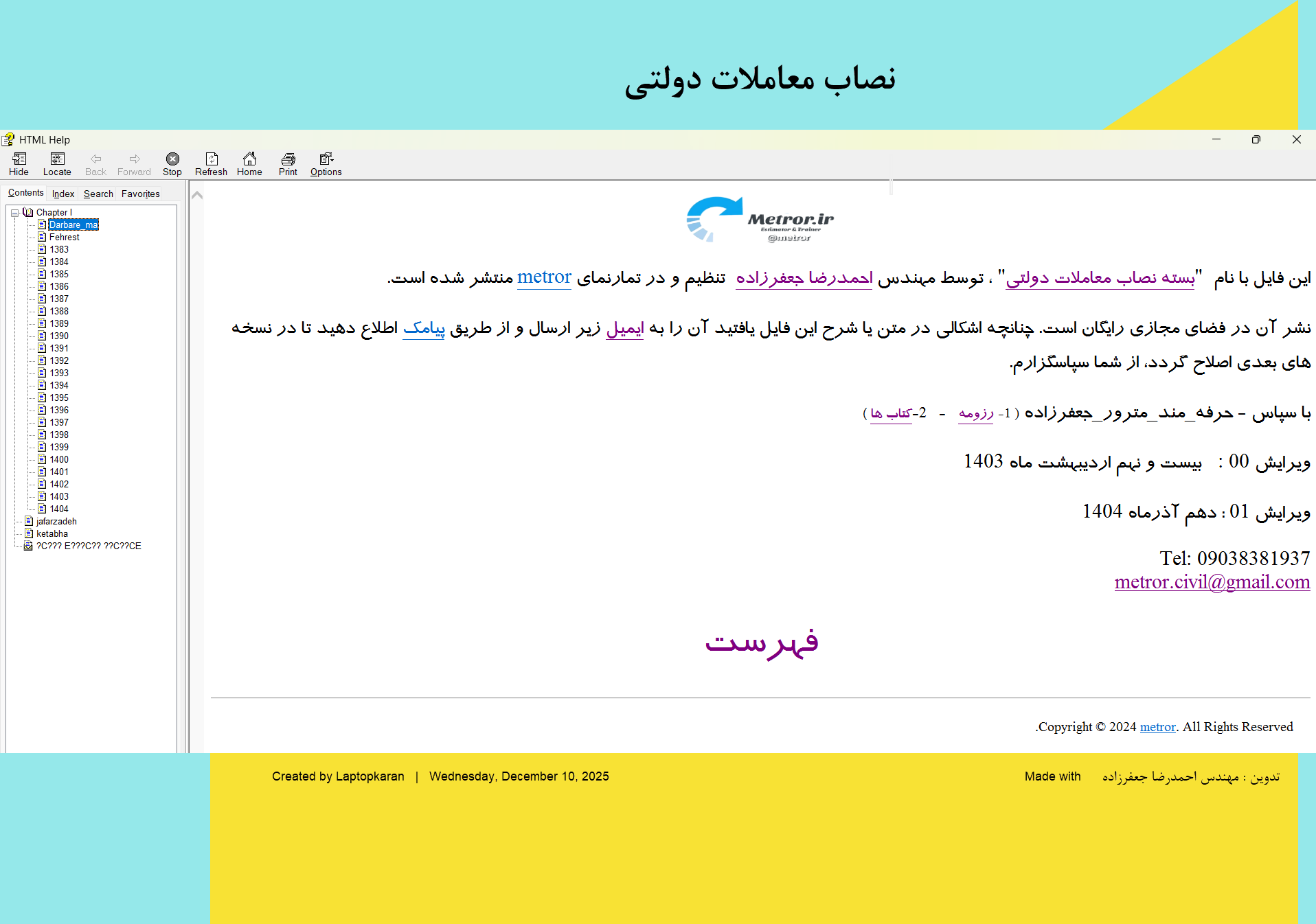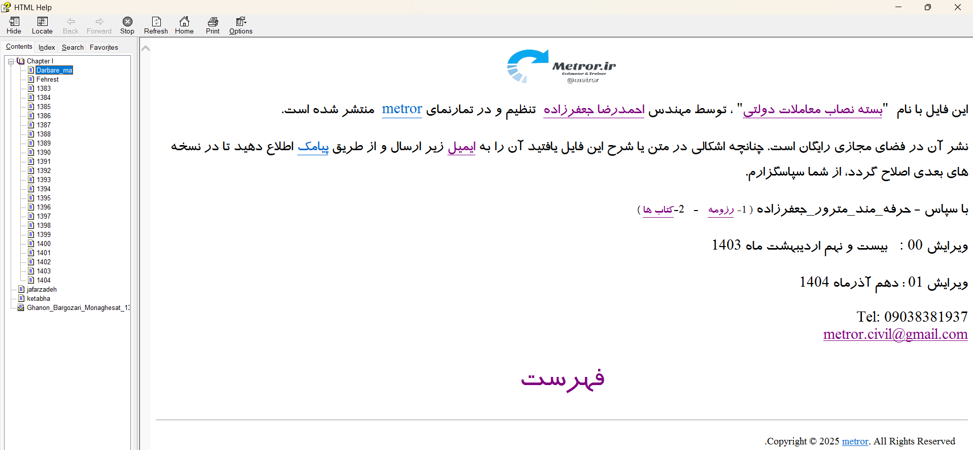 این فایل با نام "بسته نصاب معاملات دولتی" ، توسط مهندس احمدرضا جعفرزاده تنظیم و در تمارنمای metror منتشر شده است.